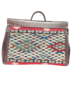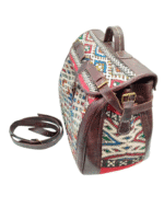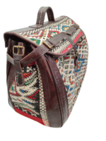 “Hand Crafted Anatolian Bag with genuine leather and authentic kilim fabric, featuring traditional geometric patterns in vibrant colors, meticulously crafted by skilled artisans.”
