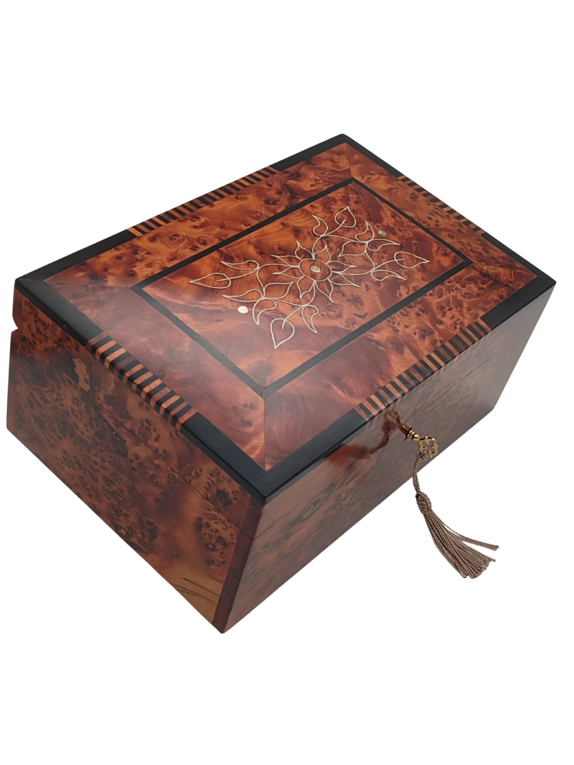 “Exquisite Iberian Andalusian Thuya Box featuring intricate floral marquetry in traditional Moorish design, handcrafted by master artisans with decorative brass key and tassel.”