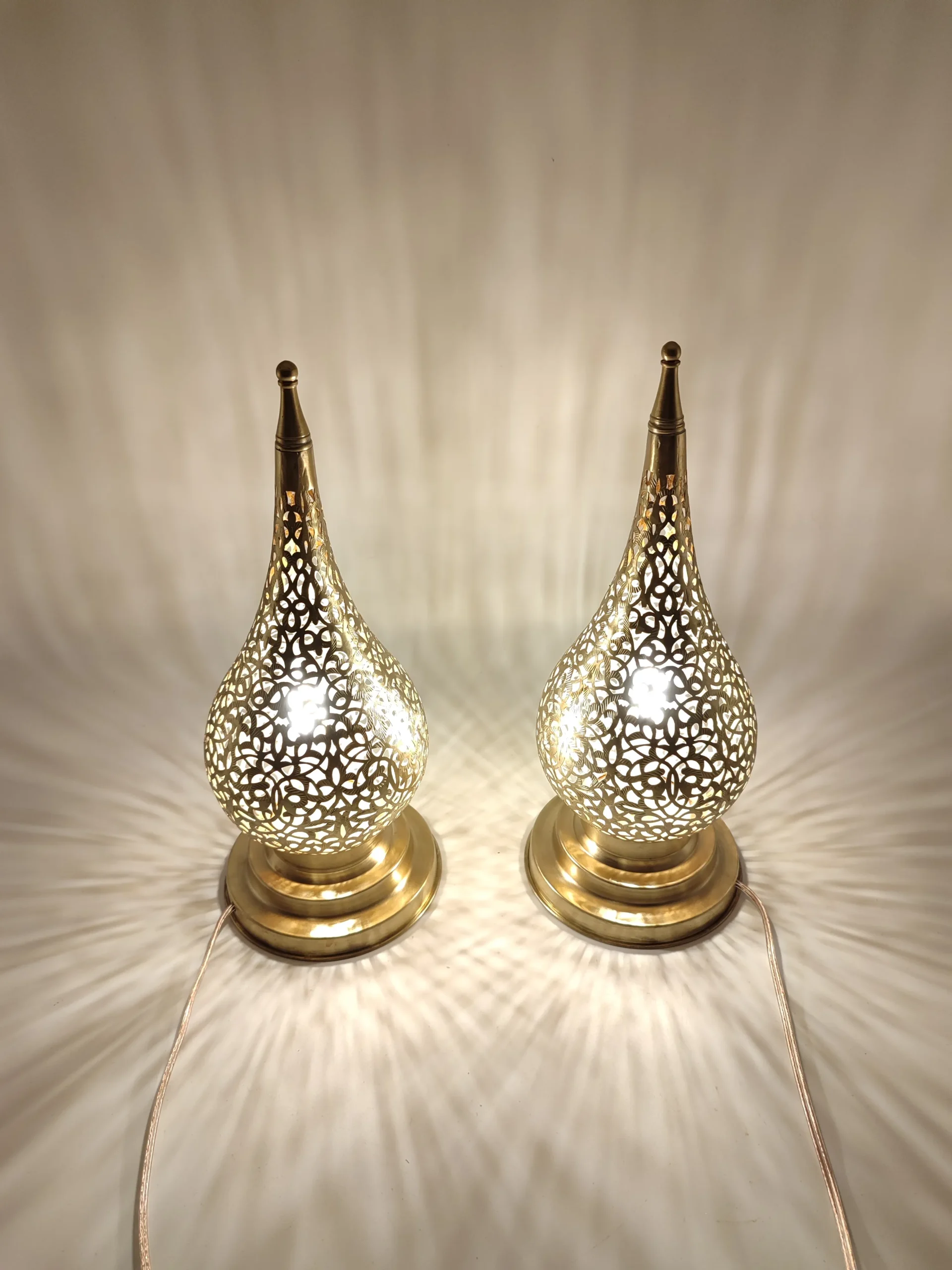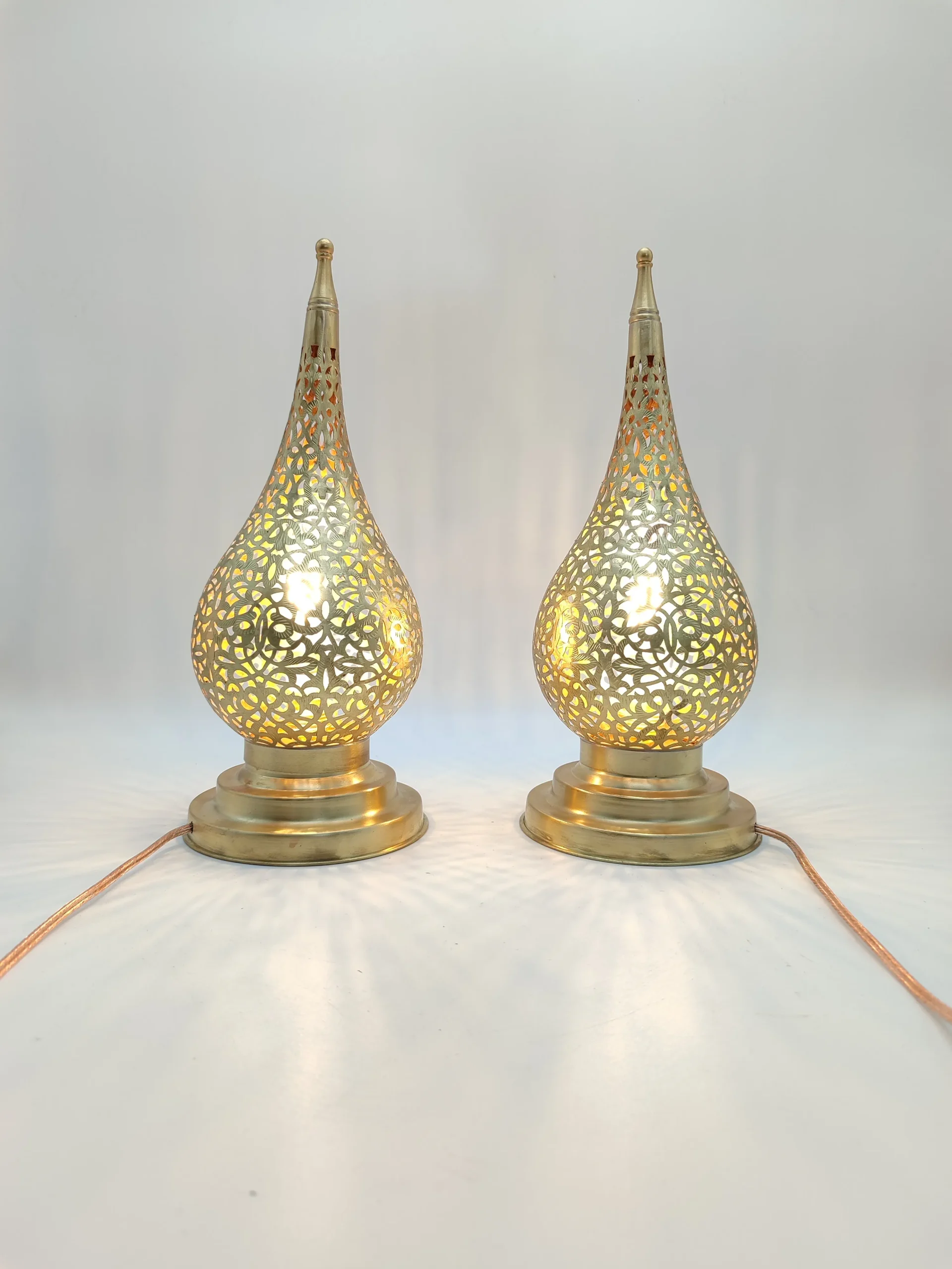 “Hand Crafted Magical Lamp – DUO teardrop-shaped – with solid copper, featuring intricate hand-perforated patterns that create mesmerizing light effects, meticulously crafted by skilled artisans.”