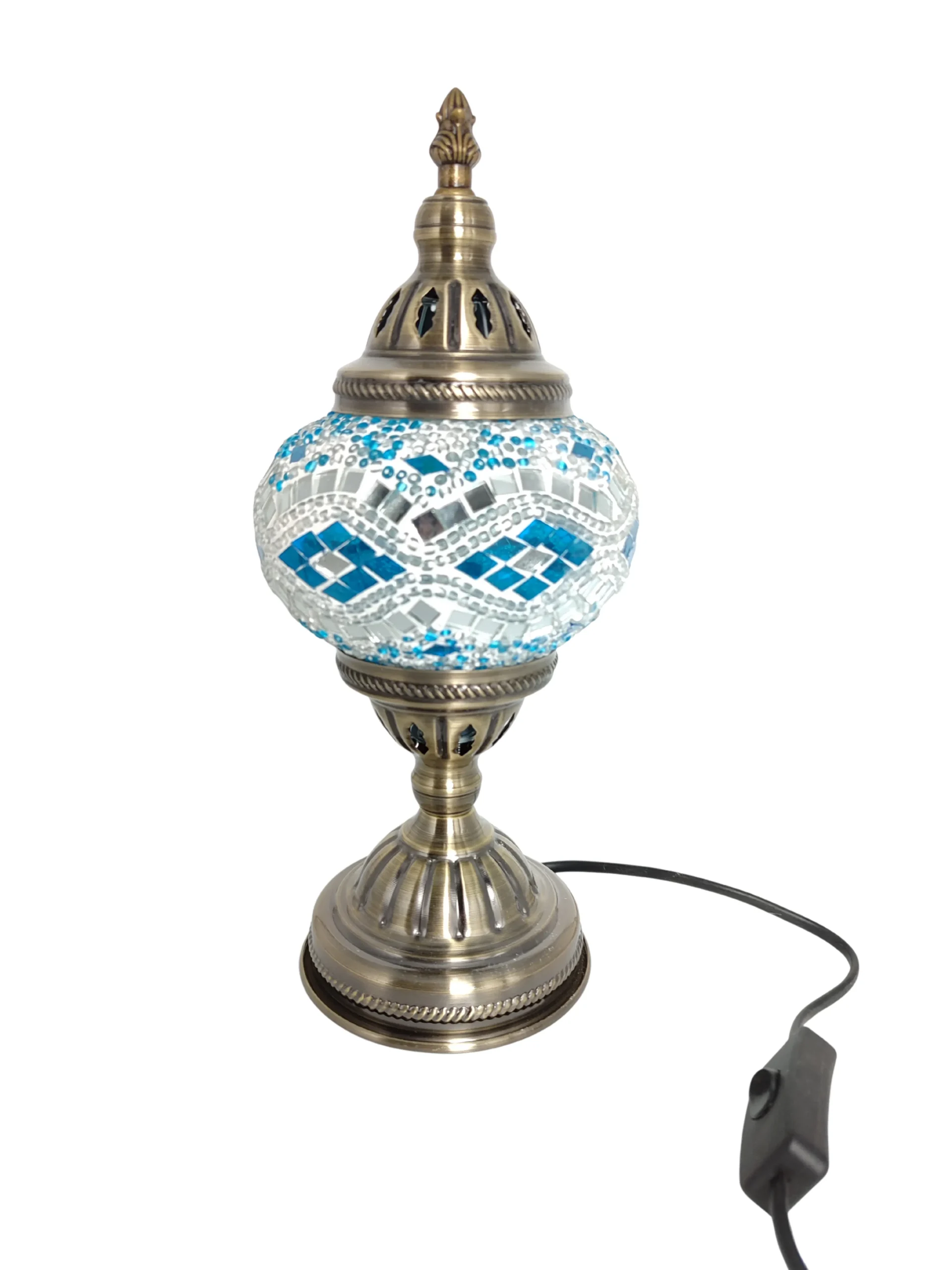 These extraordinary Turkish mosaic lamps showcase the timeless beauty of hand-cut glass, meticulously arranged in traditional patterns that reflect centuries of Ottoman artistic heritage. Unlike mass-produced lighting, each lamp features hundreds of individually placed glass pieces—carefully cut, shaped, and assembled by master craftsmen. The vibrant blues, turquoise, and golden hues are achieved through traditional glass-coloring techniques passed down through generations of Turkish artisans. The mosaic glass globe is complemented by ornate brass or bronze metalwork with intricate detailing—from the decorative base to the elaborately patterned cap—creating a harmonious balance between transparency and solidity. When illuminated, these materials transform, as light filters through the colored glass, casting enchanting patterns that dance across your walls and ceiling. This interplay between light and crafted materials creates an ambiance impossible to replicate with modern manufacturing methods, offering not just illumination but a genuine artistic experience rooted in cultural tradition.