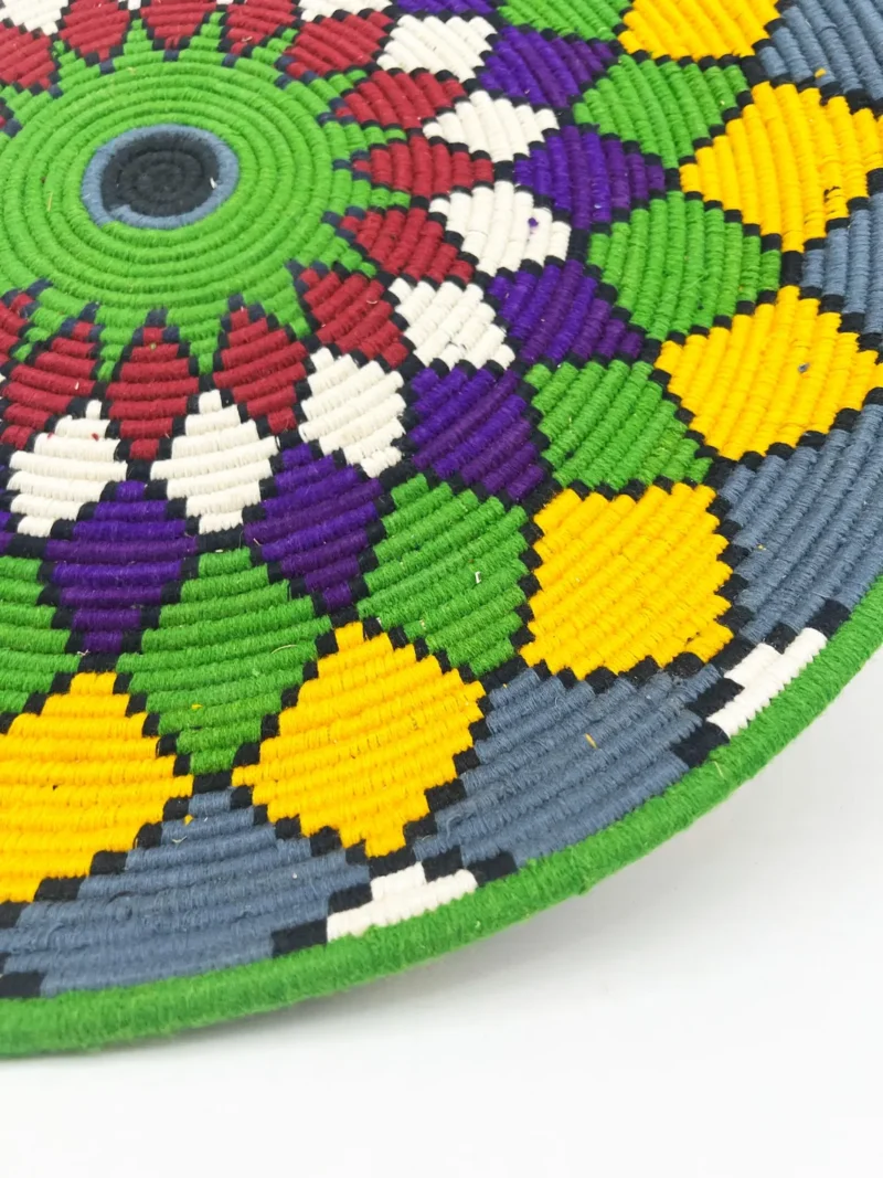 “Hand Crafted Colorful Wall-mounted Baskets featuring vibrant geometric and spiral patterns, meticulously woven by skilled artisans using traditional African techniques to create stunning wall art displays.”